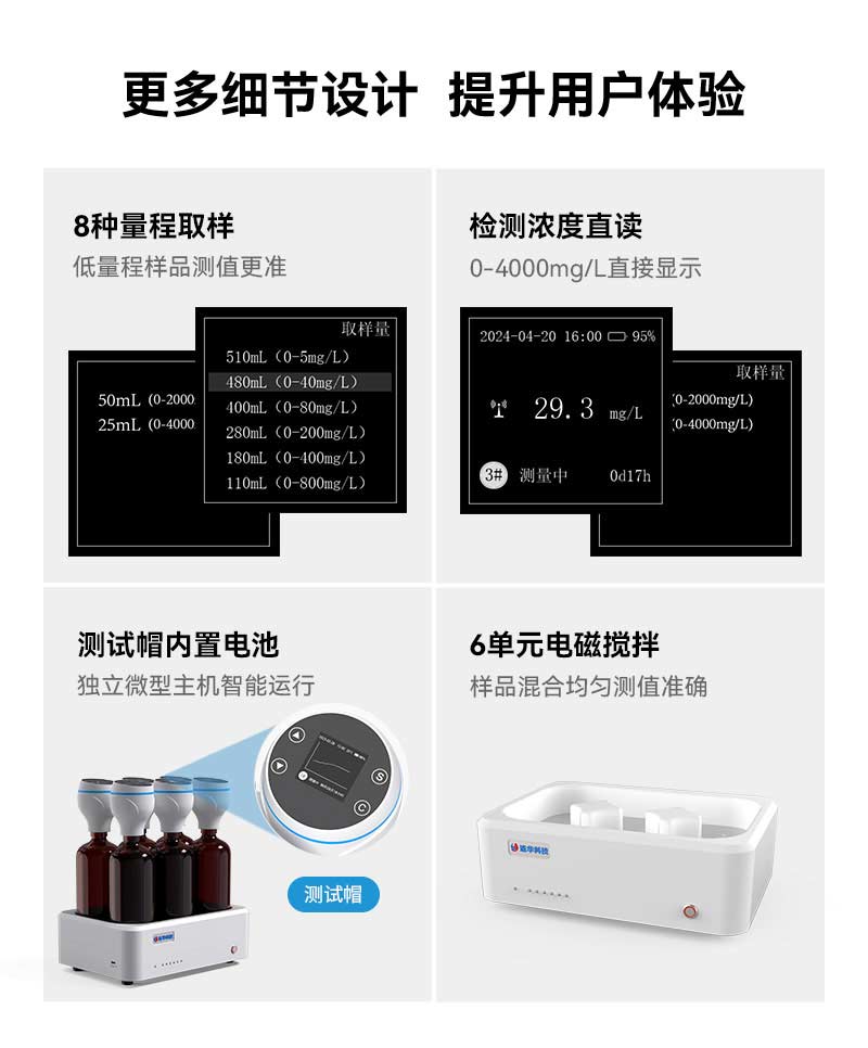 值得一提的是,LH-BOD306的每個測試帽都相當于一個微型主機,內(nèi)置CR-P2電池和1.5吋OLED屏幕,可獨立運行并查看檢測數(shù)據(jù)、數(shù)據(jù)曲線圖等信息。這一創(chuàng)新設計使得即使在主機短暫停電的情況下,測試也不會受到影響,確保了數(shù)據(jù)的連續(xù)性和完整性。
