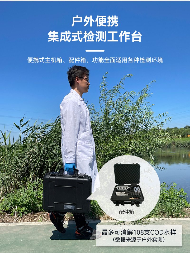 光源的持久耐用也是LH-C600的一大亮點(diǎn)。內(nèi)置8個(gè)可見光波長LED光源,壽命長、更穩(wěn)定且故障率更低,大幅降低了使用和維護(hù)成本。同時(shí),戶外檢測便攜性也是該儀器的一大優(yōu)勢。采用主機(jī)箱+配件箱的形式,耗材、配件完備,戶外檢測方便快捷。大容量鋰電池更是確保了儀器在戶外無電源條件下連續(xù)工作8小時(shí)以上的能力,讓水質(zhì)檢測不再受地點(diǎn)和時(shí)間限制。