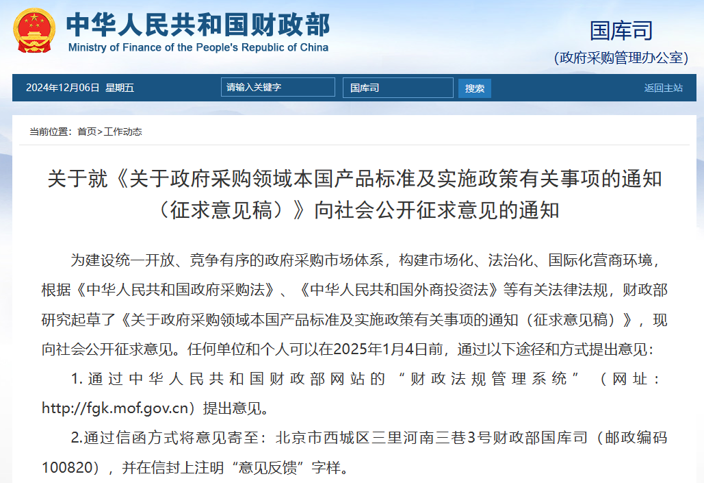 近日,財(cái)政部在其官方網(wǎng)站上發(fā)布了《關(guān)于政府采購領(lǐng)域本國(guó)產(chǎn)品標(biāo)準(zhǔn)及實(shí)施政策有關(guān)事項(xiàng)的通知(征求意見稿)》,并向社會(huì)各界公開征求意見。該通知旨在構(gòu)建統(tǒng)一開放、競(jìng)爭(zhēng)有序的政府采購市場(chǎng)體系,保障各類經(jīng)營(yíng)主體平等參與政府采購活動(dòng),并明確提出在政府采購活動(dòng)中,給予本國(guó)產(chǎn)品相對(duì)于非本國(guó)產(chǎn)品20%的價(jià)格評(píng)審優(yōu)惠。
