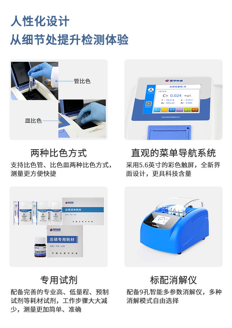 1、多種測定模式:具有雙光路無干涉系統,可測定低量程總磷、高量程總磷。支持皿比色和管比色、預制試劑等多種測量模式;